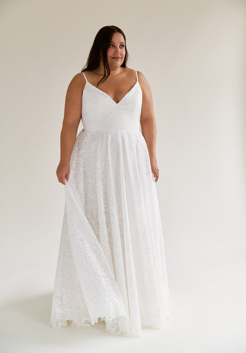 We believe a woman’s choices should never be limited by the size she wears, so Kaslo is also available in sizes 00-40. In our extended size range (16+), we added extra boning to the bodice and raised the back for greater support. We also shaped the waist and hip lines to fit curvier body types. No matter your size, our gowns are designed to make you look and feel your best.