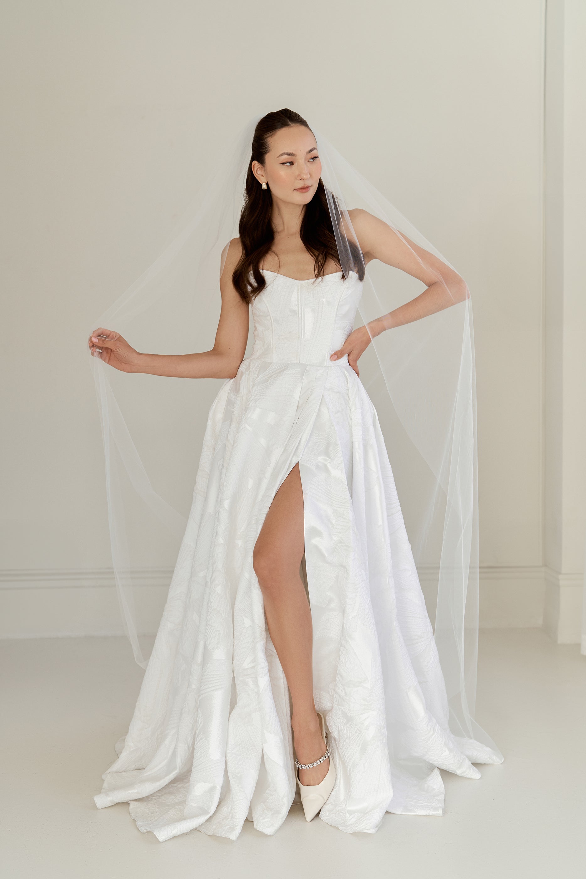A classic veil for a classic beauty. Available as a fingertip veil, measuring 50"; a chapel-length veil, measuring 90"; or a cathedral veil measuring 120", you can dial up the drama or opt for a more understated look. The classic veil is made with off-white tulle, and is as timeless as they come.