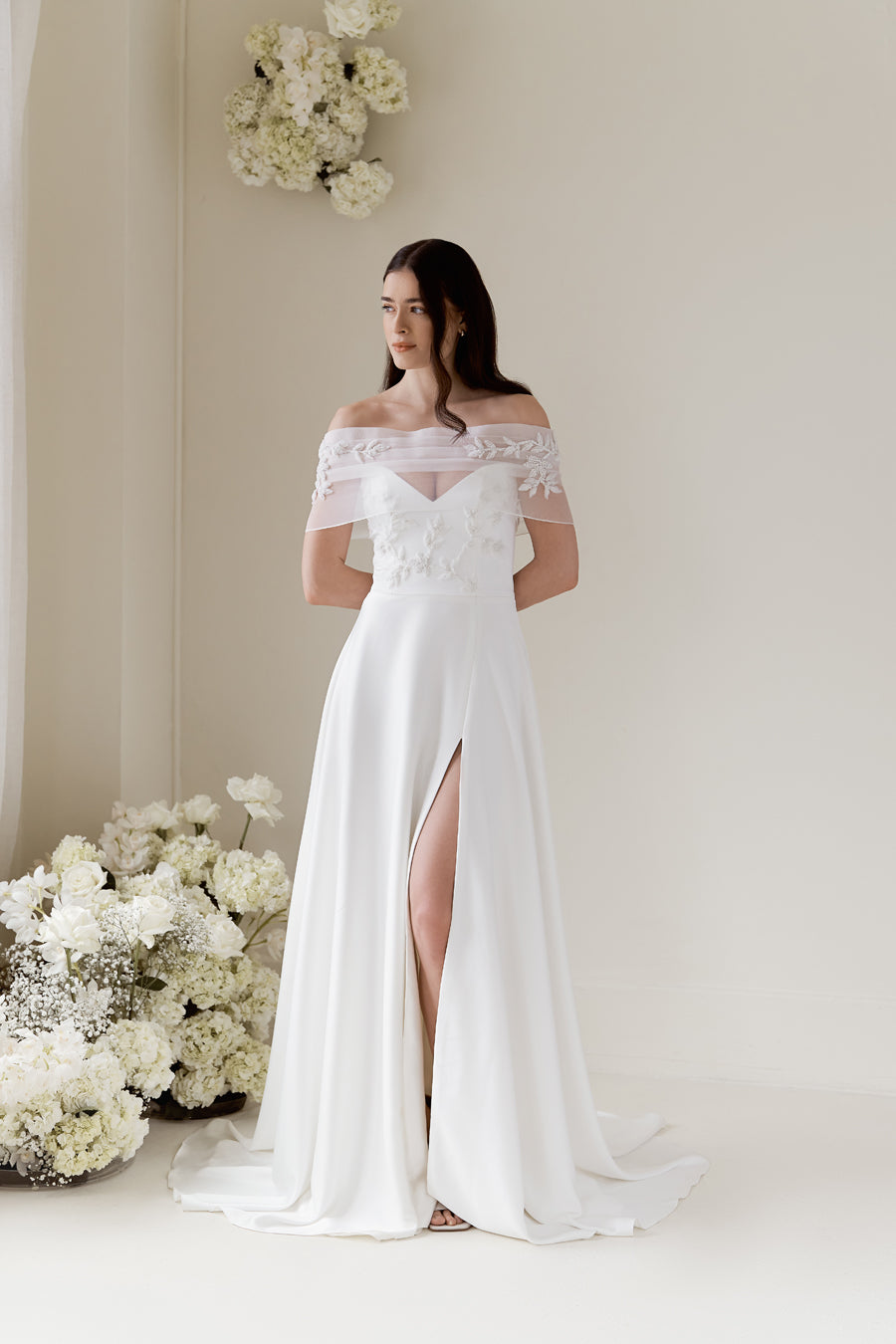 Naomi blends a modern, ethereal sensibility with old Hollywood glamour. Its fitted, strapless sweetheart bodice – finished with hand-embroidered botanical motifs – balances the thigh-high side slit; its pleated organza topper frames the collarbones. Naomi’s romantic silhouette, in a comfortable recycled satin, makes this gown one of our favourites of this collection.