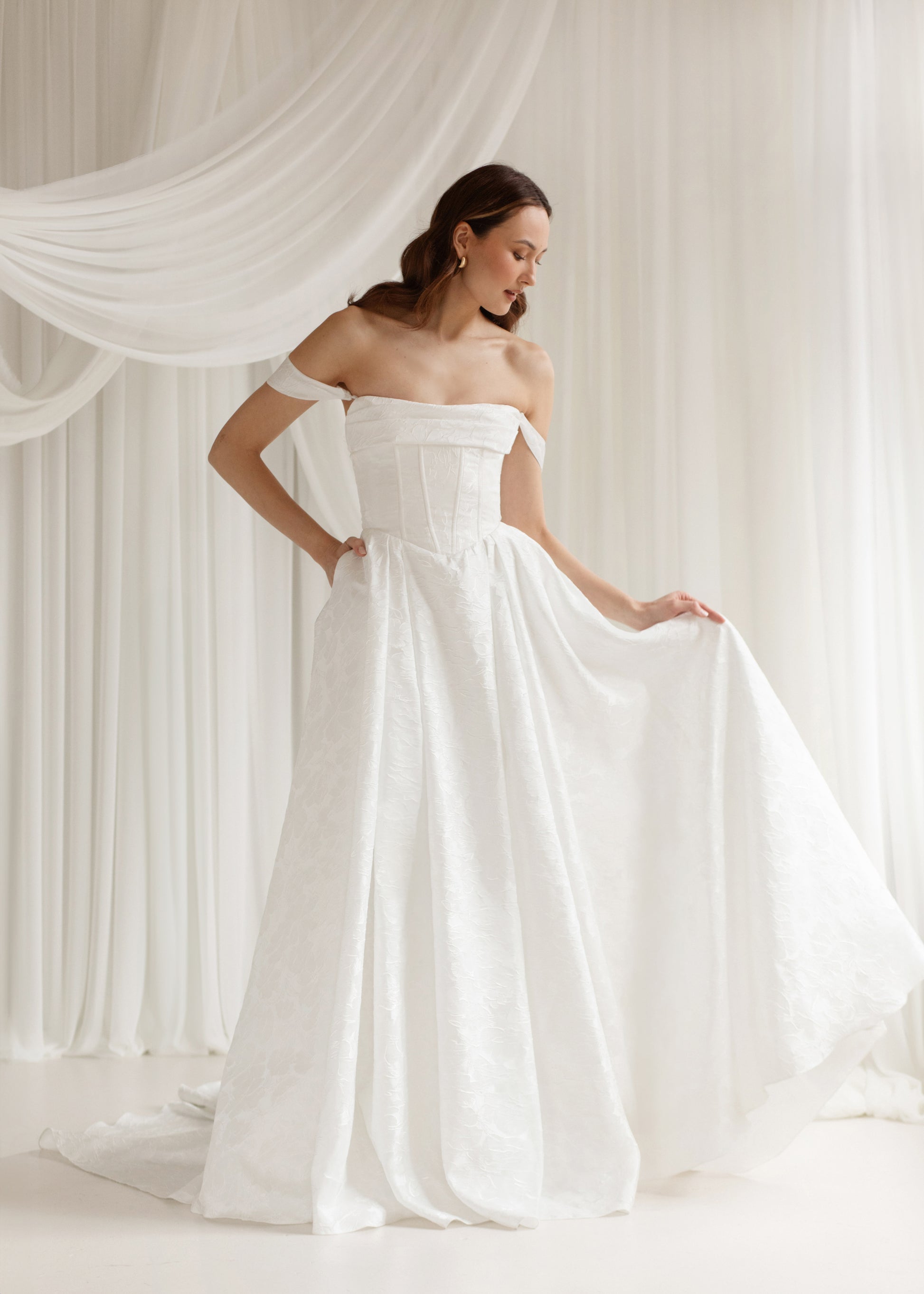 Adelina is about tradition and elegance – but with that trademark Truvelle twist. You’ll recognise classic bridal design details, like her romantic exposed boning and gentle cowl across the bodice. Or, say, her gently curved neckline contrasting with her subtly sculptural basque waist. Her skirt, too, with a dramatic 80" train, is shaped by its classic box pleat detail. She’s rendered in Truvelle’s own namesake Adelina Jacquard, bringing a dimensional, modern touch to these classic design elements. She’s lined with off-white midori and finished with a lace-up back. You can opt for a detachable modesty panel at the back, or for a detachable swag sleeve to frame your collarbones.