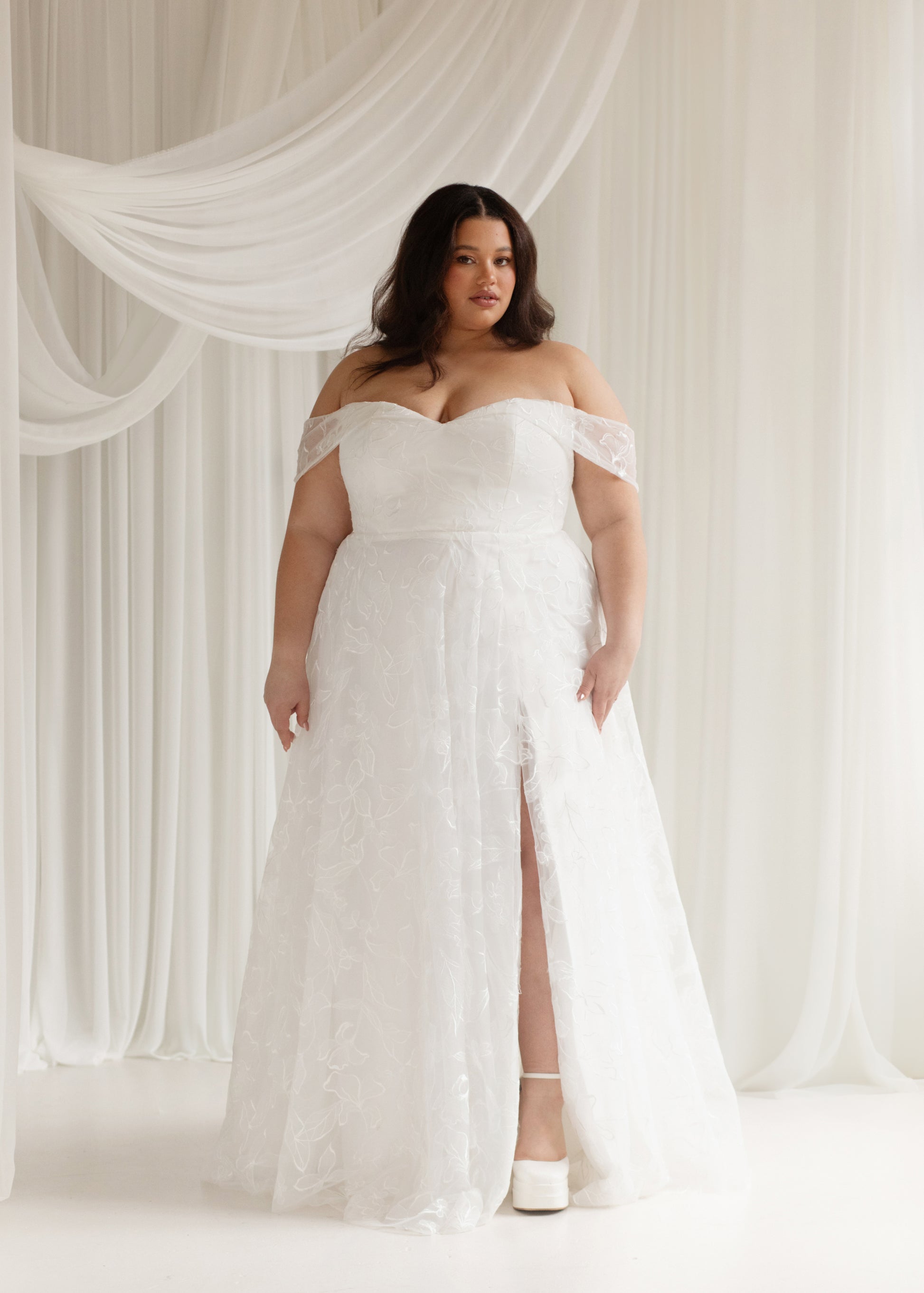 Danielle is a hopeless romantic – from her strapless bodice and gentle sweetheart neckline with a soft U at the centre, to her multi-layered full circle skirt with side slit and 80" train. She’s made for hours of twirling across the dance floor with your new spouse. She’s made with namesake Danielle tulle from top to bottom, and finished with an optional off-the-shoulder sleeve that ties at the back. We won’t blame you if it’s love at first sight.