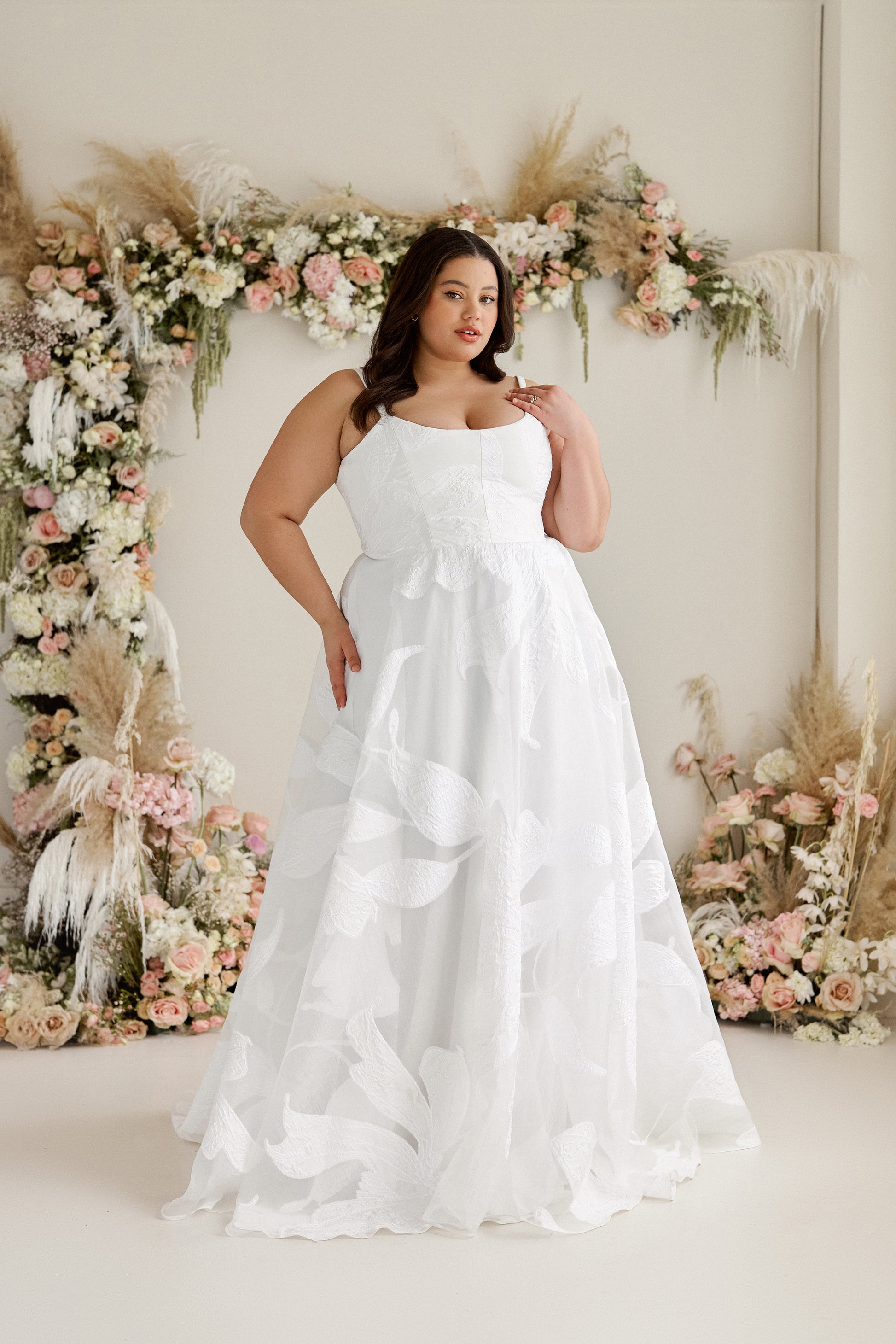 Named for the Greek goddess of rainbows, the iris flower is emblematic of natural beauty and effortless grace. The Iris gown cultivates these same traits: with a refined silhouette, featuring a shallow scoop neck bodice and half inch straps, a full circle skirt with a dramatic 110" train – our longest ever – and a comfortable recycled crepe lining. All rendered in its namesake botanical motif, a lightweight Iris organza, as unforgettable as the bride who wears it.