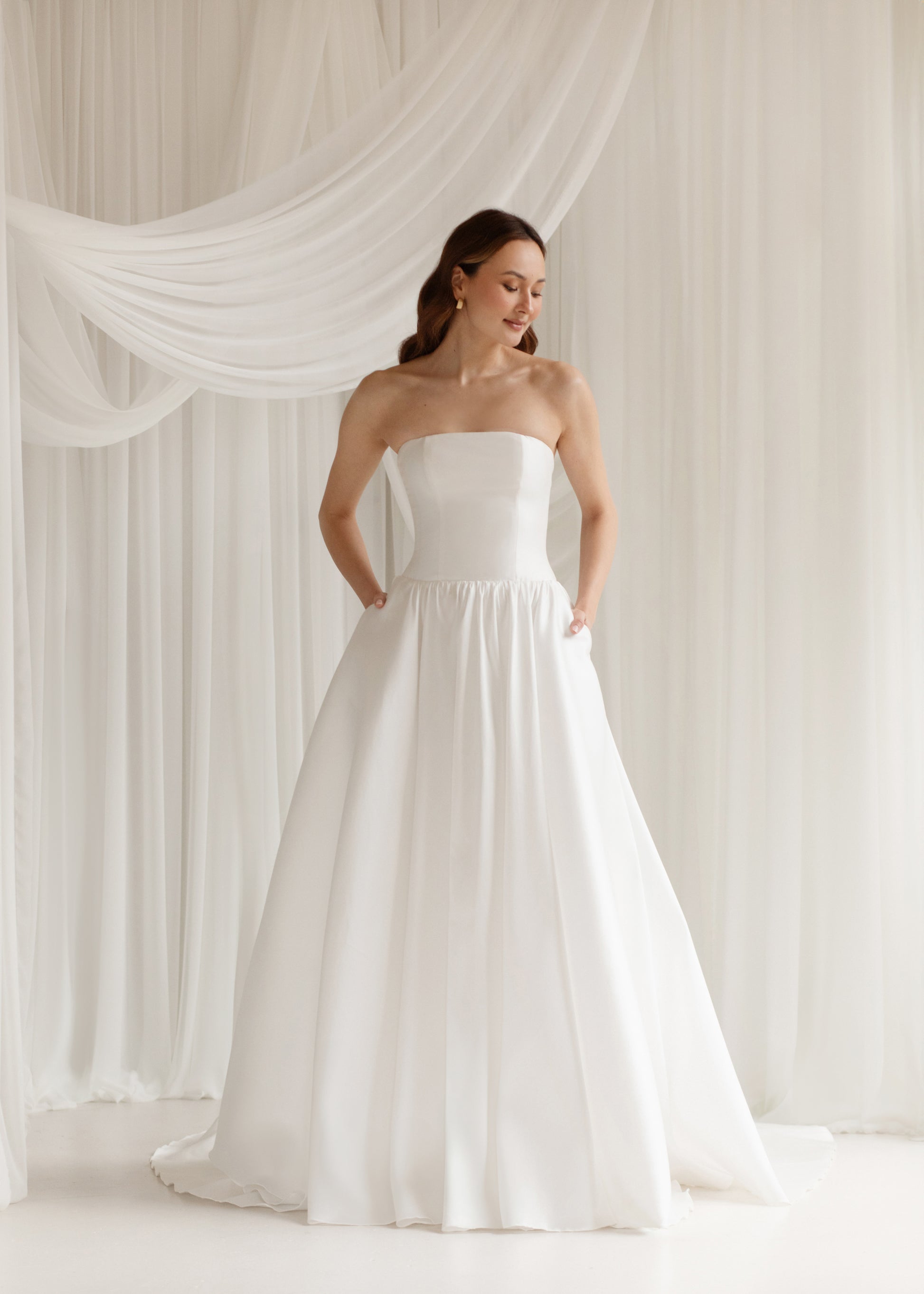 Sophisticated and modern, the Leah gown is defined by her effortlessly chic drop waist. The strapless bodice is clean and minimal with a straight neckline, and gives way to a sculptural gathered full circle skirt and 80" train. Leah’s refined romance doesn’t skip those important details, though: she’s complete with pockets and a lace-up back with an optional detachable modesty panel. She’s made with luxurious mikado and lined with soft off-white midori – comfortable, beautiful, unforgettable.