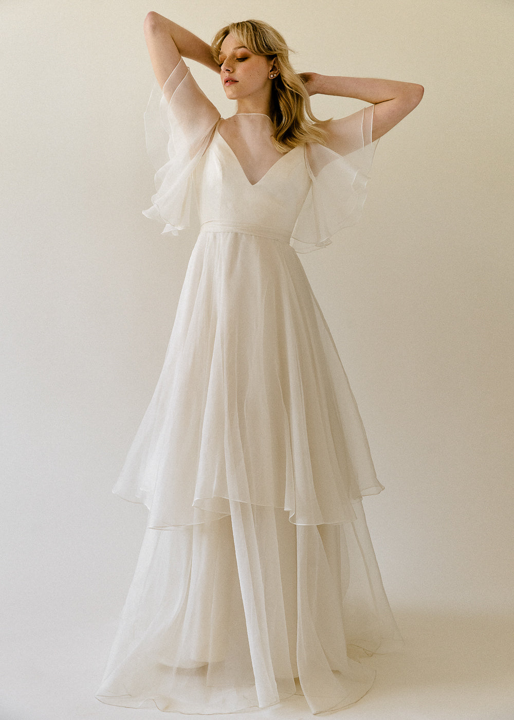 A dreamy wedding dress with cream silk organza and flutter sleeves.