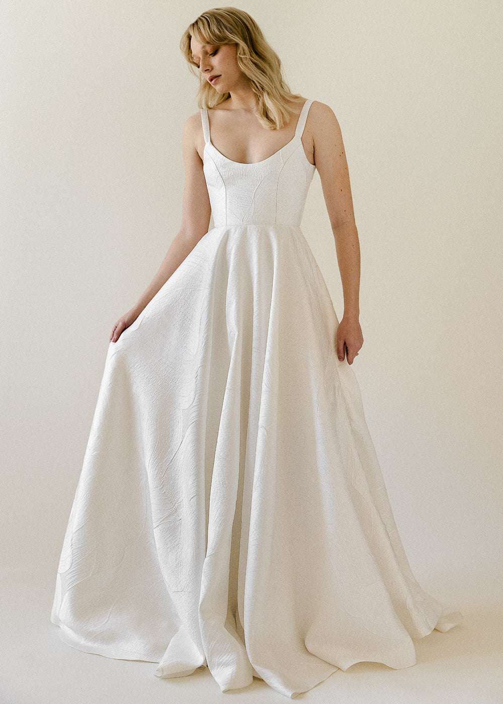 A scoop neck and back wedding dress in a textured jacquard fabric