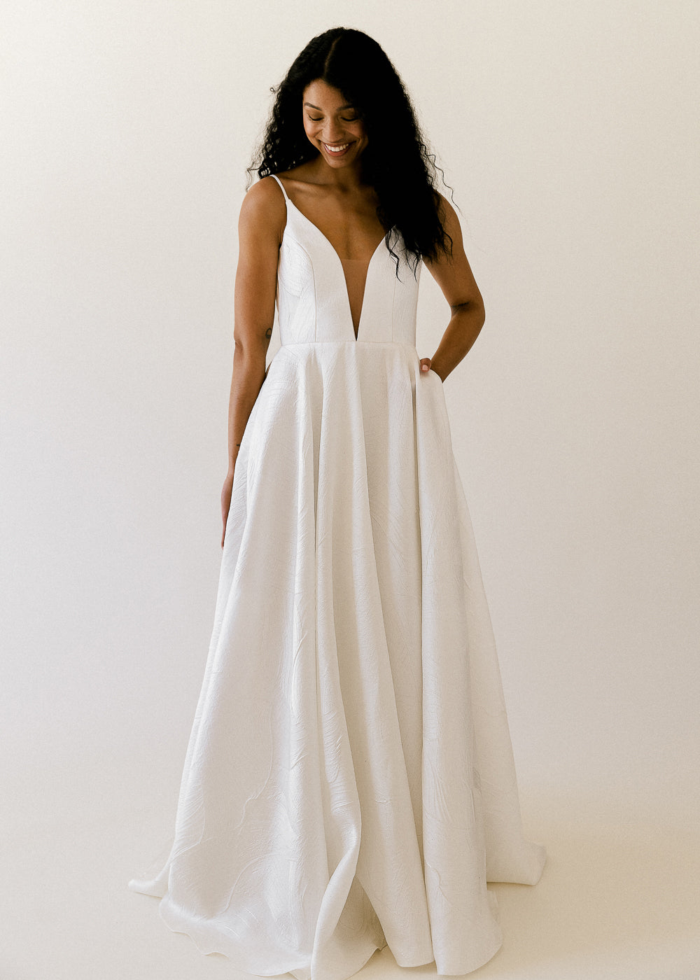 In the light, Lucinda glows. The modern plunging neckline is balanced with a whimsical brushstroke jacquard fabric, updating a romantic, regal silhouette for the present day. Lucinda is also available in extended sizing; the design was undertaken with care, adding elements like extra boning for comfort and support. The most important detail? Lucinda has pockets for all your wedding day must-haves.