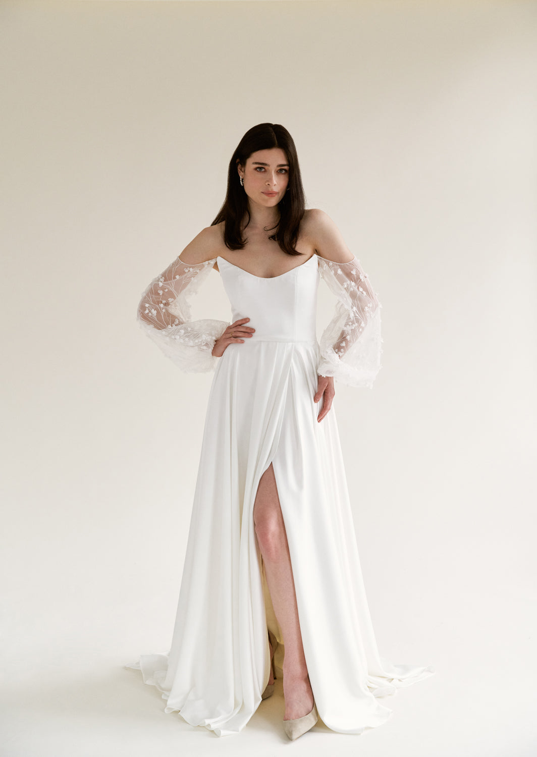 A strapless satin gown with an a-line slit skirt and detachable floral lace sleeves