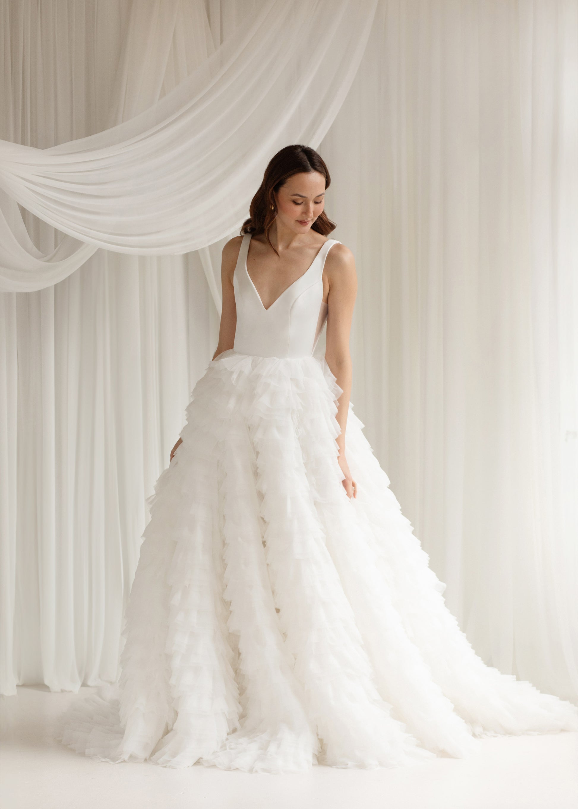 A dramatic wedding dress with a plunging neckline + voluminous tulle skirt of tiered ruffles