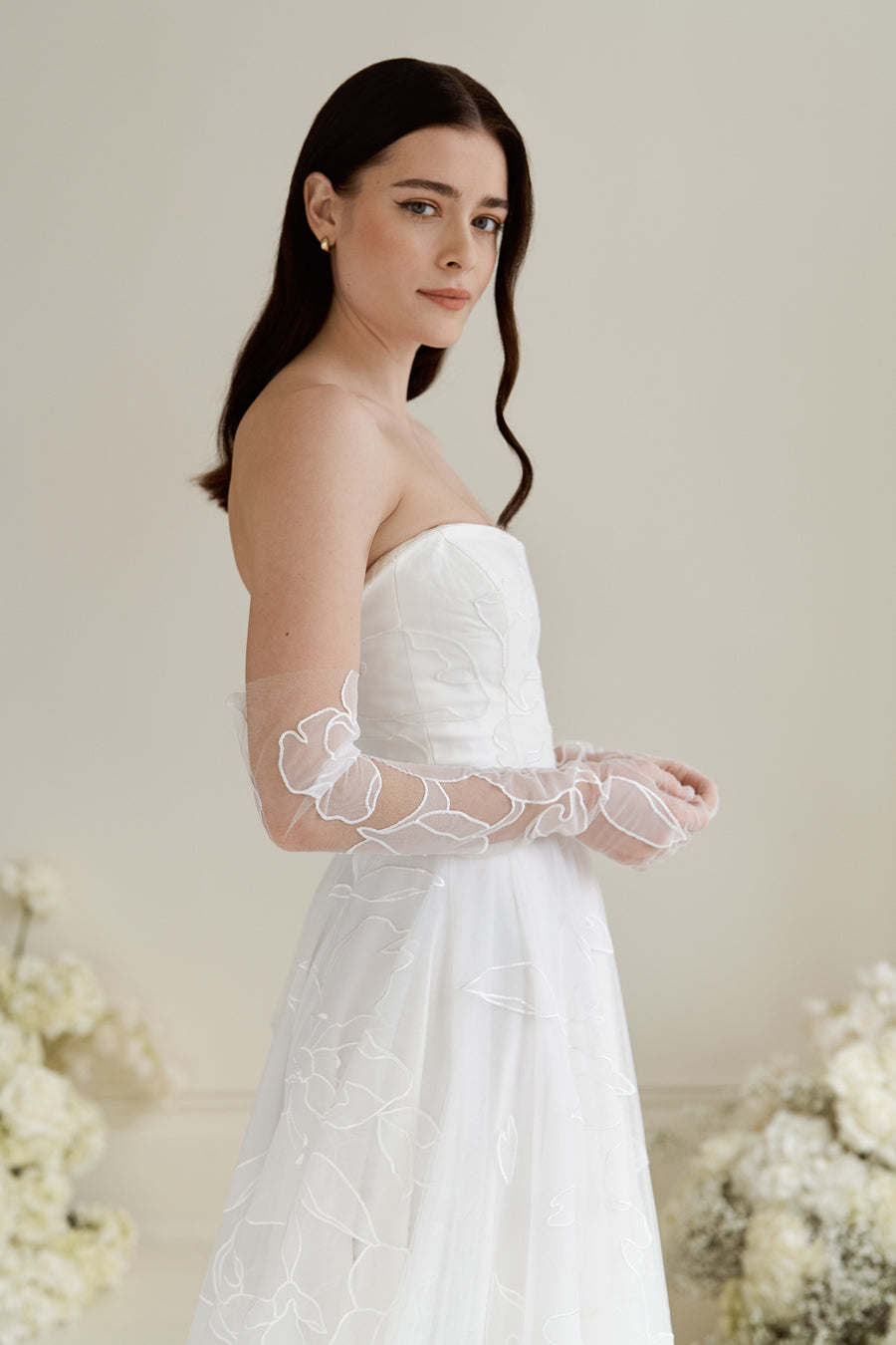 If we have the opportunity to match our accessories to our gown, you can bet we're going to take it. Enter the Simone gloves — a fitted, elbow-length glove made in the same fresh botanical lace as our Simone gown. They are available in two styles: classic or point, the latter of which can be seen here.