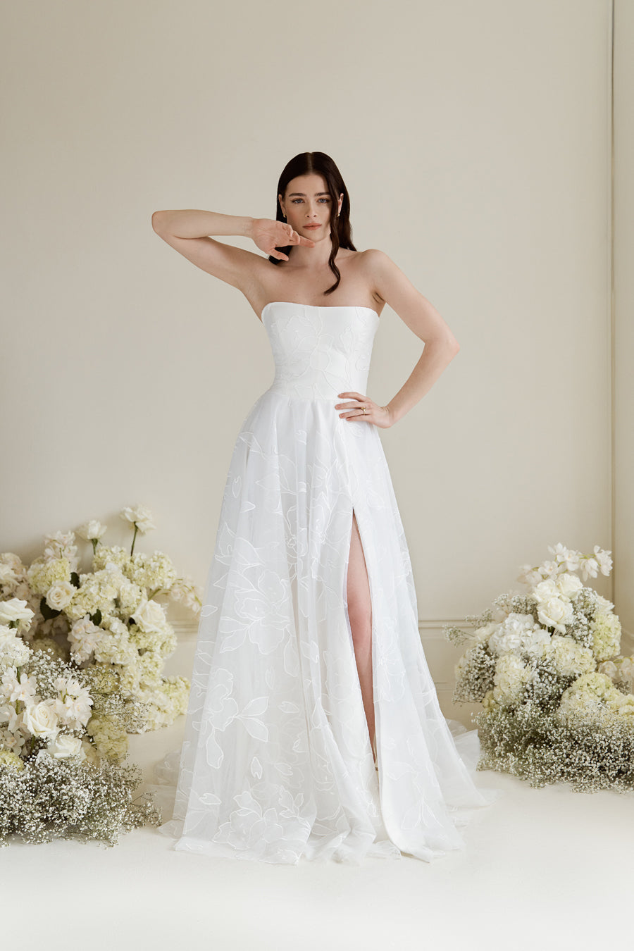 .Simone was designed for the romantics among us. She has a full circle skirt and thigh-high slit, and is finished with a botanical lace overlay that feels fresh, elegant, and effortless. She is this collection's most customizable gown, and can be worn strapless (as seen here), with gloves, or with detachable Juliet puff sleeves.