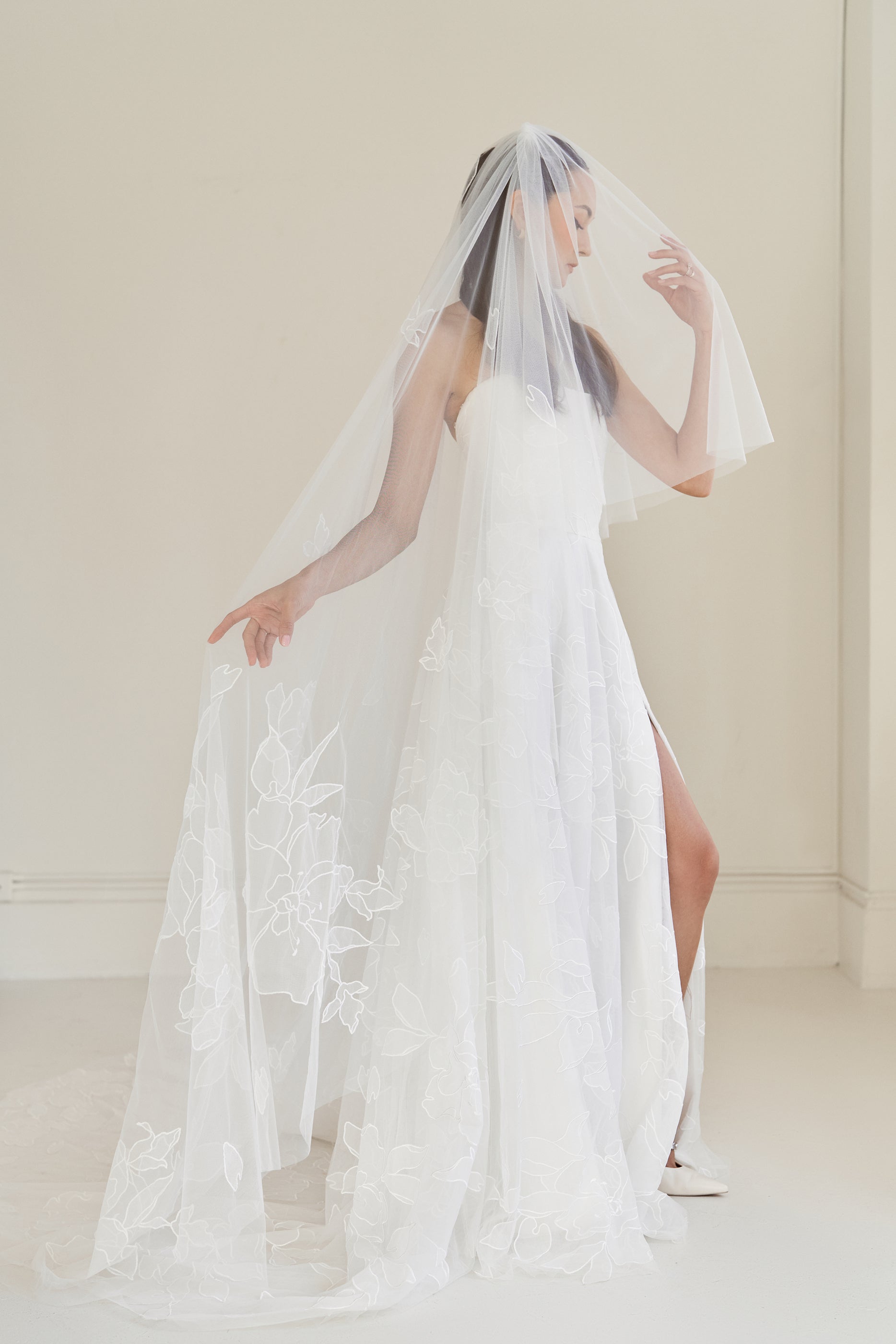We love a matching moment, especially when it looks this good. Introducing the Simone veil — a tulle veil with trickling botanical lace embroidery made to perfectly match our Simone gown. This veil is available in three lengths — 90" (chapel) with a 28″ blusher, 50" (fingertip) with a 20" blusher, or 120" (cathedral) without a blusher.